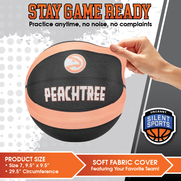Engineered for quiet performance, the Atlanta Hawks Peach Tree Silent Basketball delivers a true game-day feel without the noise. With a regulation Size 7 build (9.5" diameter, 29.5" circumference), it matches the official specs used in professional and college basketball. The high-quality PU foam provides a responsive bounce, while the solid foam core adds durability for long-lasting use. This ball is wrapped in a full-coverage printed sleeve featuring bold Atlanta Hawks Peach Tree graphics, making it just as striking on display as it is in play. The airless design means no inflation is needed. This ball will not deflate, lose shape, or flatten over time. Always ready to roll, it’s perfect for use indoors or out, whether on tile, hardwood, or carpet. Ideal for quiet dribbling at home, in classrooms, gyms, or anywhere you want to train without making a sound.