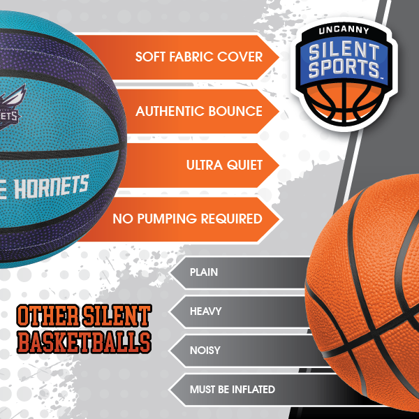 Engineered for quiet performance, the Charlotte Hornets Silent Basketball delivers a true game-day feel without the noise. With a regulation Size 7 build (9.5" diameter, 29.5" circumference), it matches the official specs used in professional and college basketball. The high-quality PU foam provides a responsive bounce, while the solid foam core adds durability for long-lasting use. This ball is wrapped in a full-coverage printed sleeve featuring bold Charlotte Hornets graphics, making it just as striking on display as it is in play. The airless design means no inflation is needed. This ball will not deflate, lose shape, or flatten over time. Always ready to roll, it’s perfect for use indoors or out, whether on tile, hardwood, or carpet. Ideal for quiet dribbling at home, in classrooms, gyms, or anywhere you want to train without making a sound.
