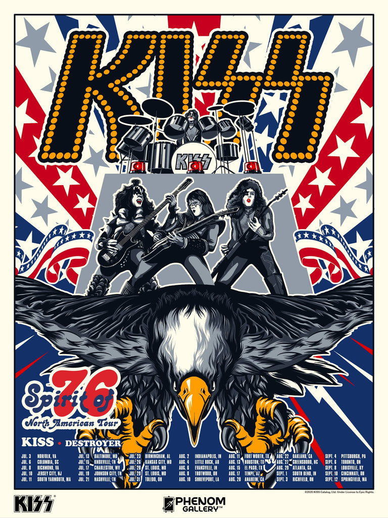 Details: 6-color screen print commemorating the historic Destroyer North American Tour, known as the Spirit of '76 tour, for KISS. Features The Demon: Gene Simmons., The Starchild: Paul Stanley., The Spaceman: Ace Frehley & The Catman: Peter Criss.