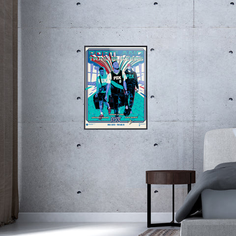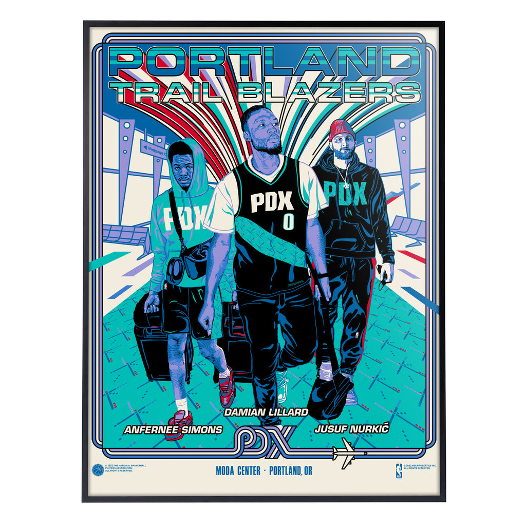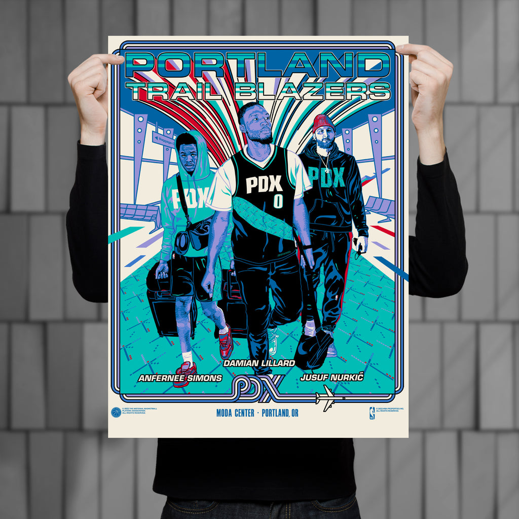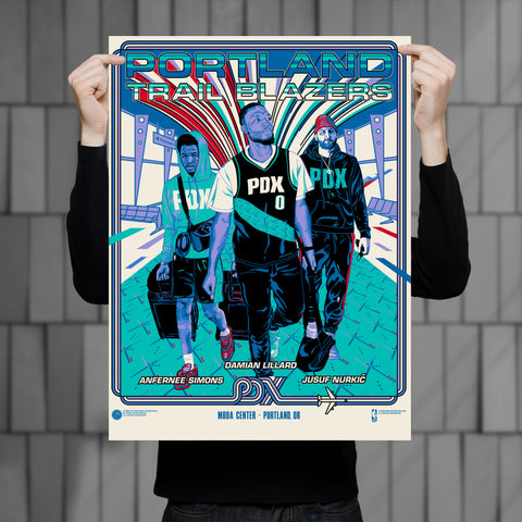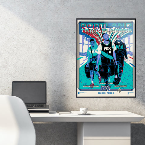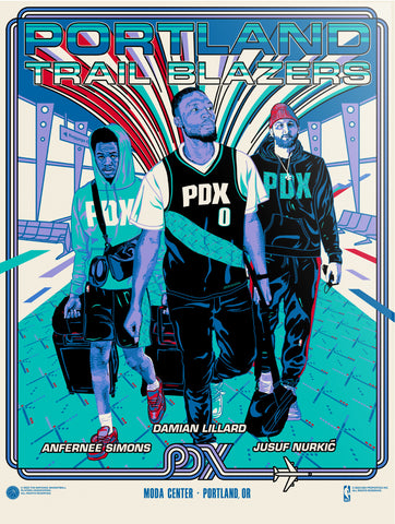 Details: 6-color silk-screen is part of Phenom Gallery National Basketball Association collection. This print features Portland Trailblazers Damian Lillard, Anfernee Simons and Jusuf Nurkic.